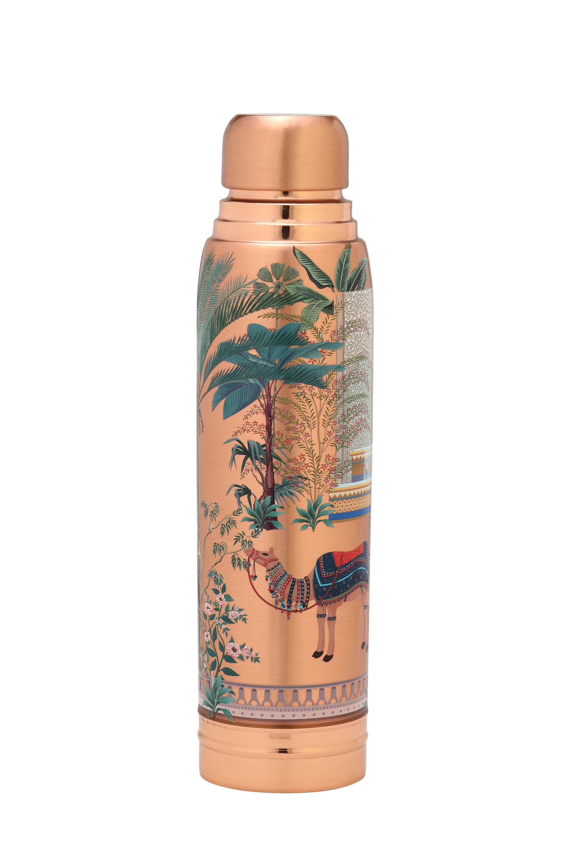 A bottle that brings together ancient wellness and timeless art — Ayursip Camel Mirage is a 1000 ml pure copper bottle inspired by the serene beauty of desert life and the charm of Indian miniature paintings.