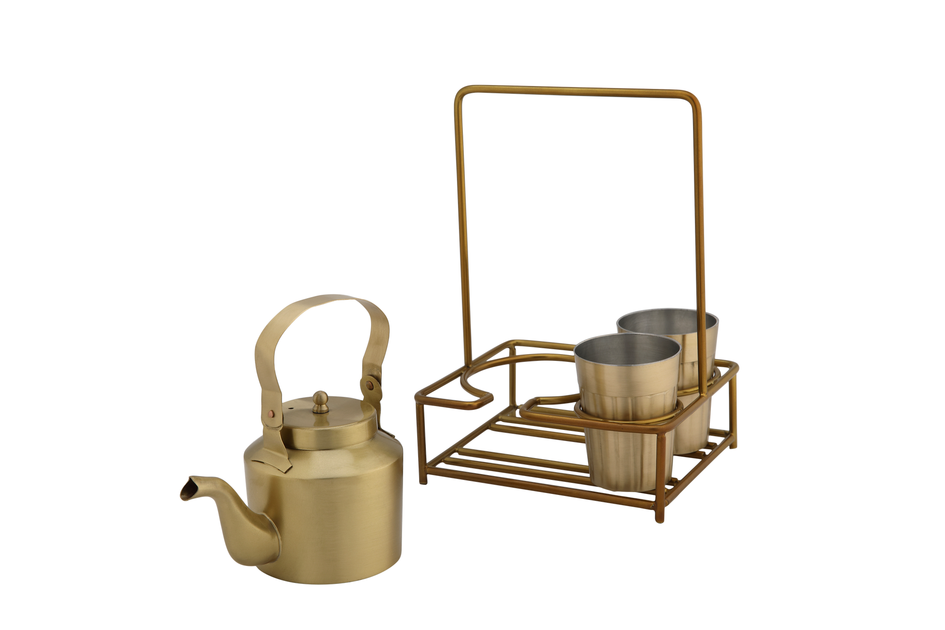 The brass-finished kettle and stand recreate the warm, familiar feel of roadside tea stalls, while the stainless-steel inner lining of the glasses ensures safe, durable, everyday use.